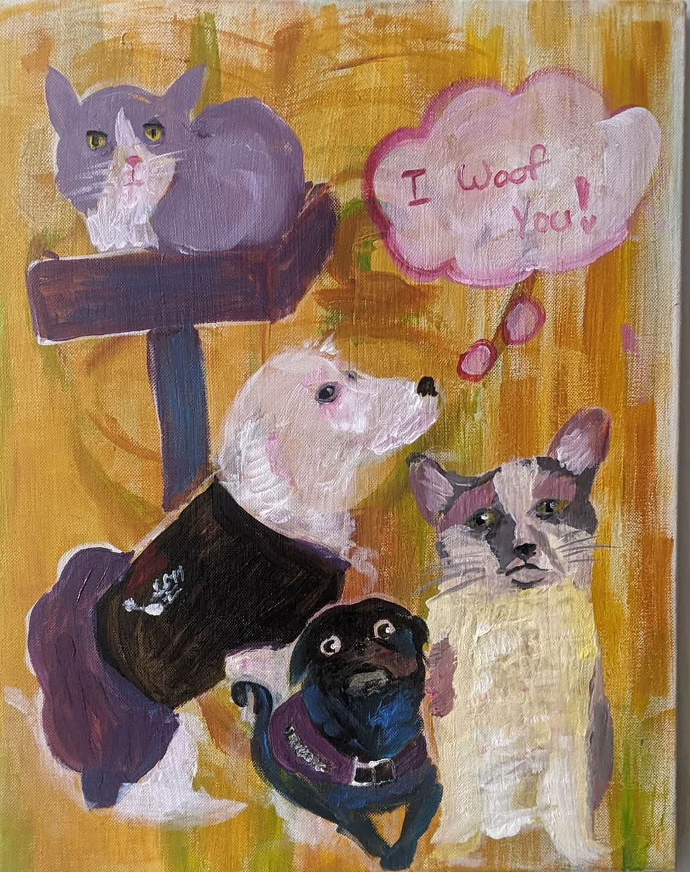 Charming and heartwarming artwork featuring dogs, a cat, and a thought bubble, capturing the bond between humans and animals.
