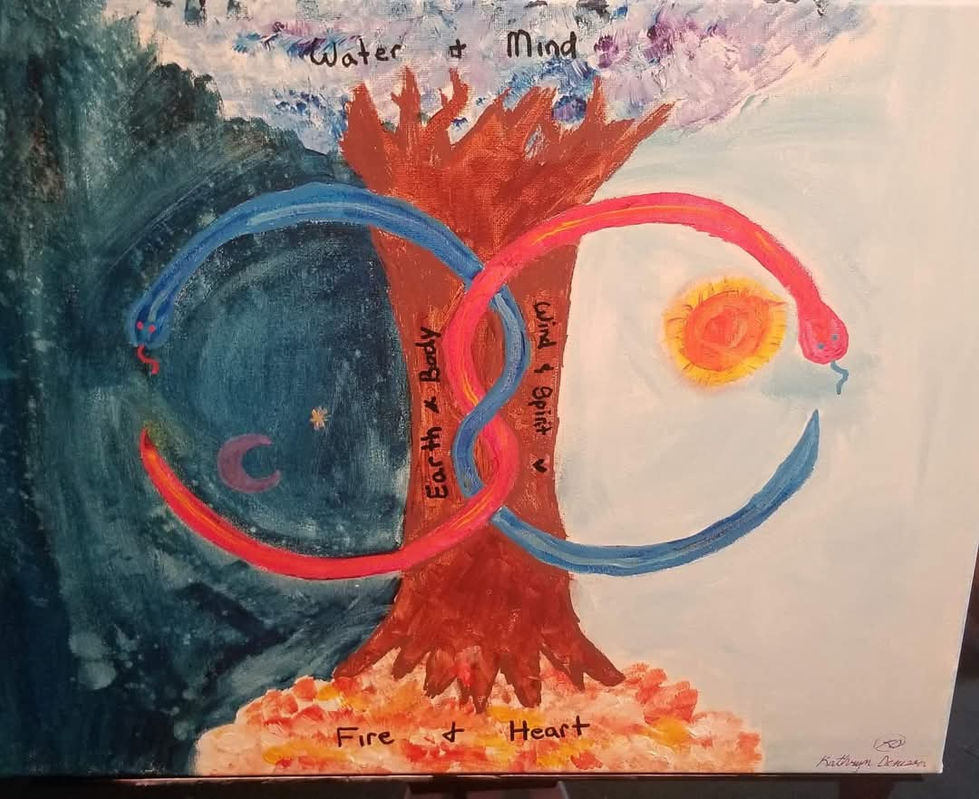 Vibrant and expressive abstract paintings featuring swirling patterns, elemental symbols, and nature elements.